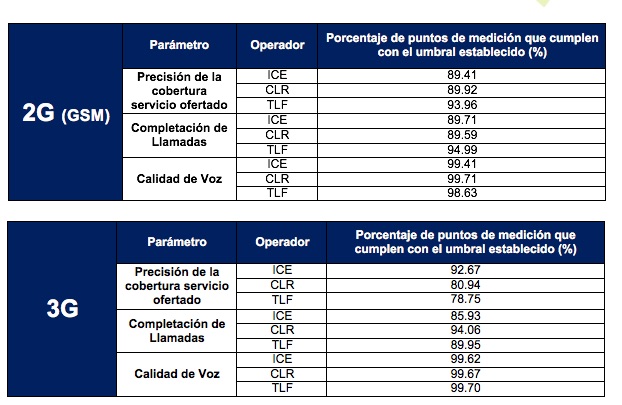 Los siguientes resultados son un extracto del informe, en los cuales se indica el porcentaje de cumplimiento del umbral reglamentariamente establecido según red móvil y por operador de telecomunicaciones.