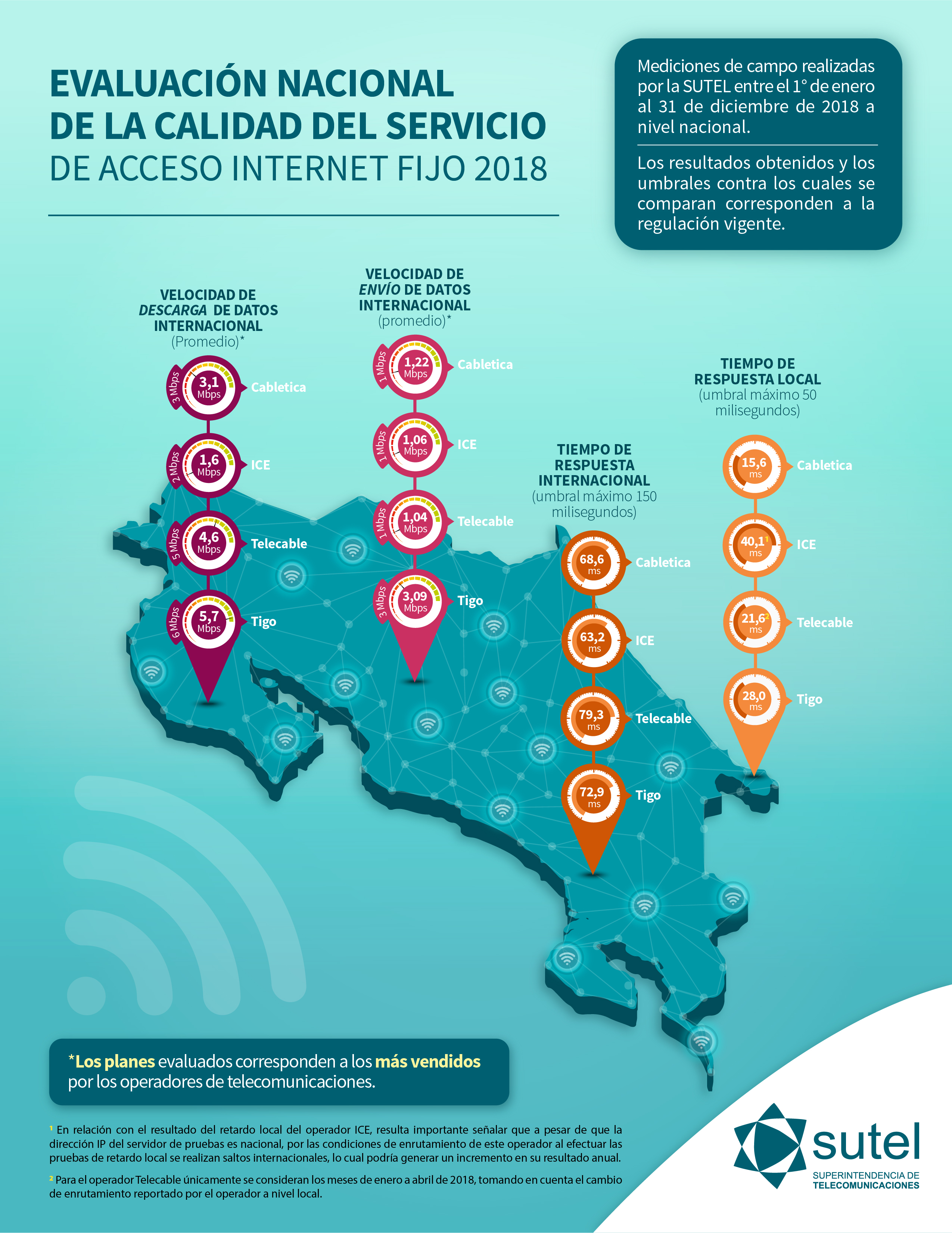 La Superintendencia de Telecomunicaciones (SUTEL), realizó la primera Evaluación Nacional del Servicio de Internet Fijo, donde midió el porcentaje de cumplimiento de la velocidad de acceso a Internet con respecto a la velocidad contratada.
