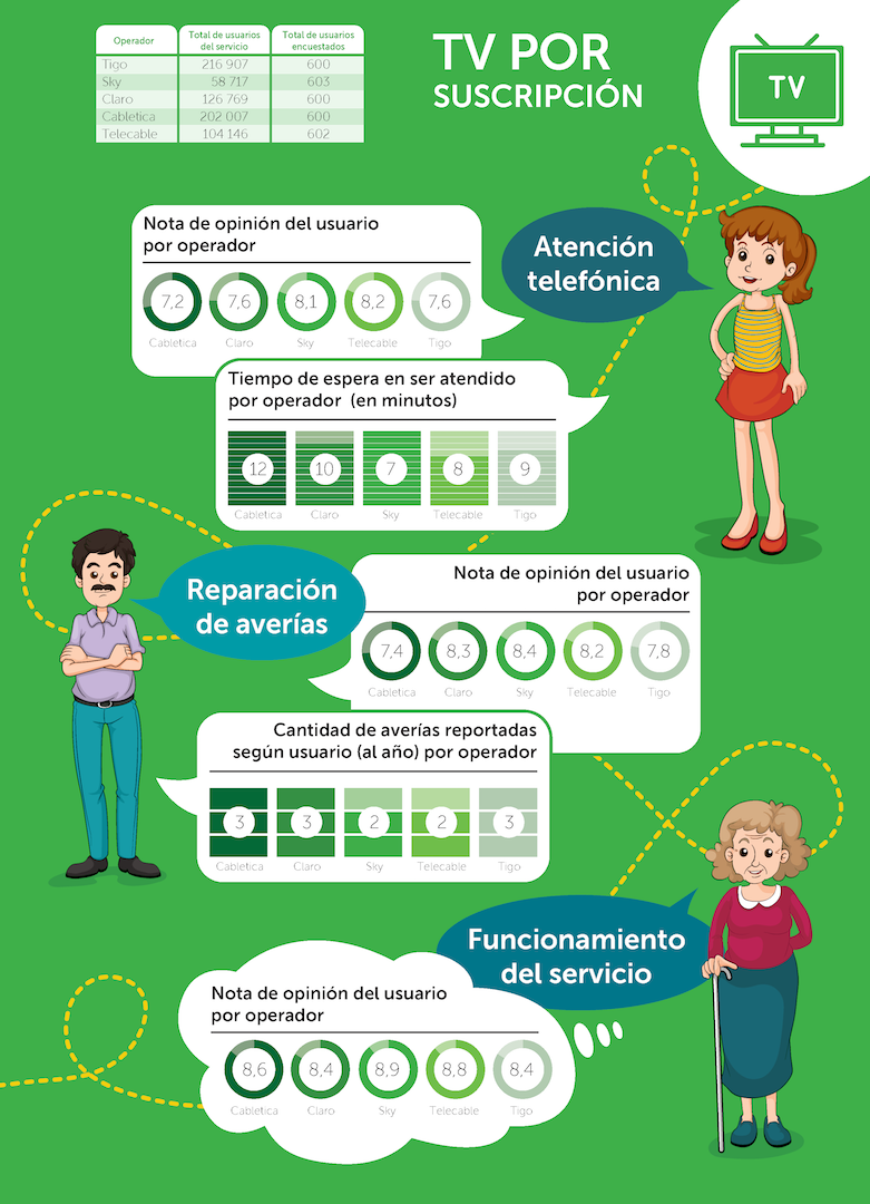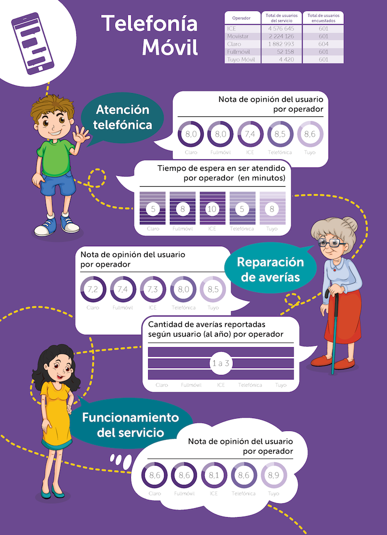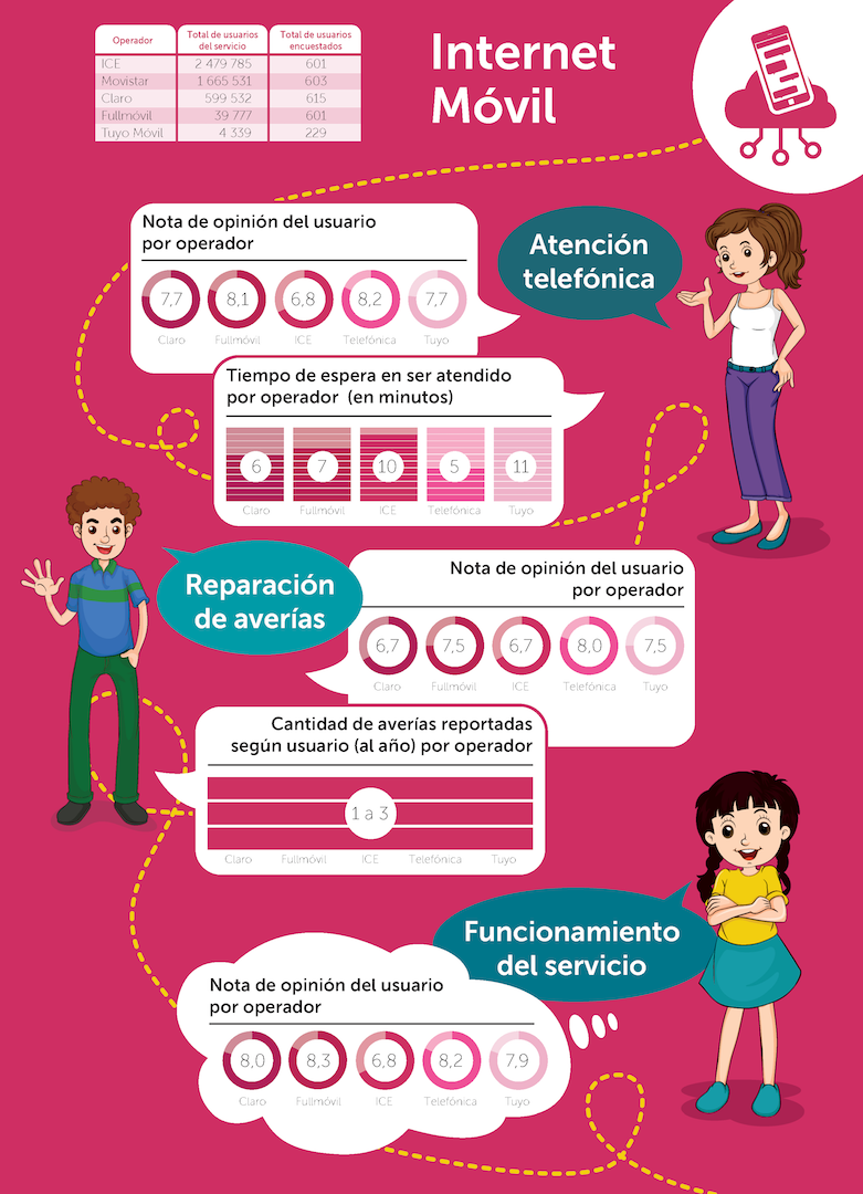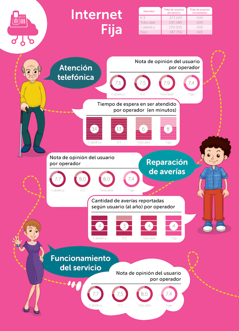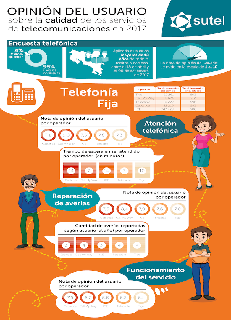 15 de noviembre 2018. La Superintendencia de Telecomunicaciones (SUTEL), encuestó a 13.659 usuarios de los servicios de Telecomunicaciones para evaluar a los principales operadores y proveedores de los servicios de: telefonía fija, telefonía móvil, Internet móvil, Internet fijo y TV por suscripción.